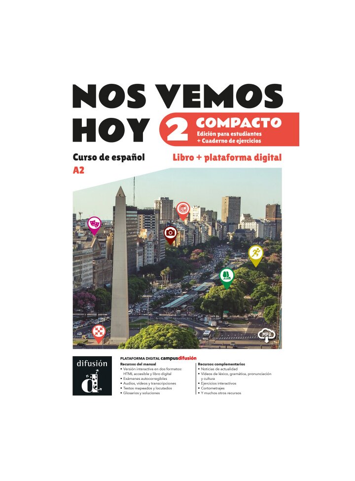 Esta edición híbrida de Nos vemos hoy 2 Compacto es la combinación ideal de libro de texto y cuaderno de ejercicios en un solo volumen físico y tecnología digital, brindándote las ventajas de ambas opciones de aprendizaje presencial, semipresencial y remoto.